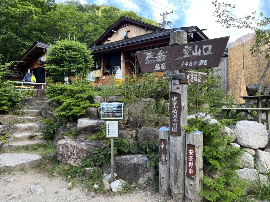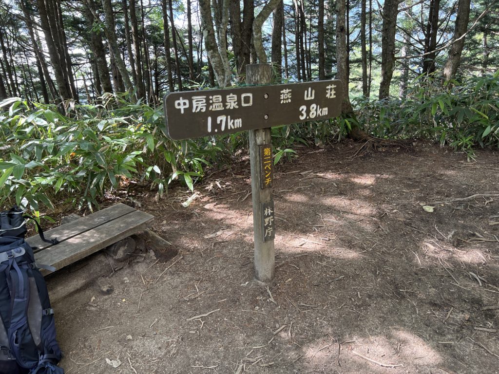 中房温泉登山口から登り始めると、第一ベンチをはじめ、4つほど休憩ポイントがあります。